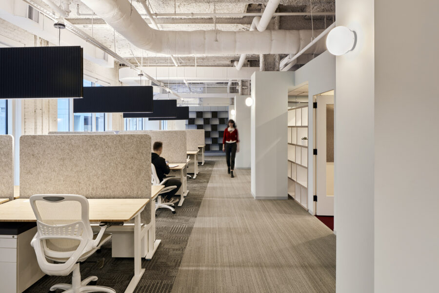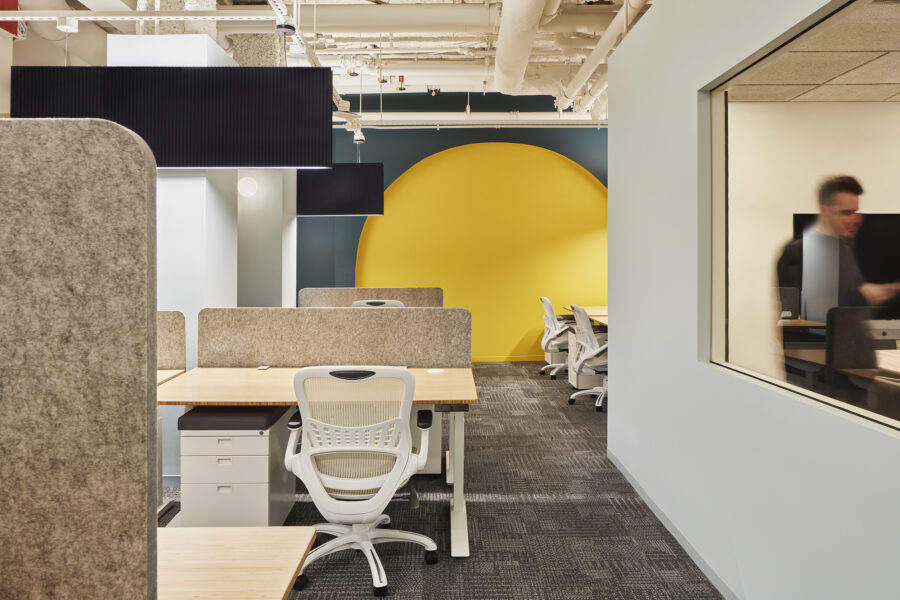 Situated in the corner of a historic building in downtown Boston, the space was divided by a thin hallway that suggested a natural buffer between workspace and a communal meditation/ multipurpose space. This public amenity’s sculptural, spur-shape expands and contracts in response to shifting functions via an acoustic fabric wall system. The operable partitions create a scalloped perimeter whose negative spaces serve as breakouts for independent work when closed and combine with the central space to accommodate classes, presentations, and public meditation sessions when open. Centered upon an illuminated oculus, the space is punctuated by an off-center cast iron column that reveals the existing building’s grit and acknowledges the messy moments that mark even the most meditatively-centered existence. The workspace consists of open desking around a central cluster of meeting rooms and library. Flexible lounges distributed throughout the open office offer opportunities for quiet, away-from-desk work while enclosed areas at the rear of the space support podcast recording and sound editing programs.