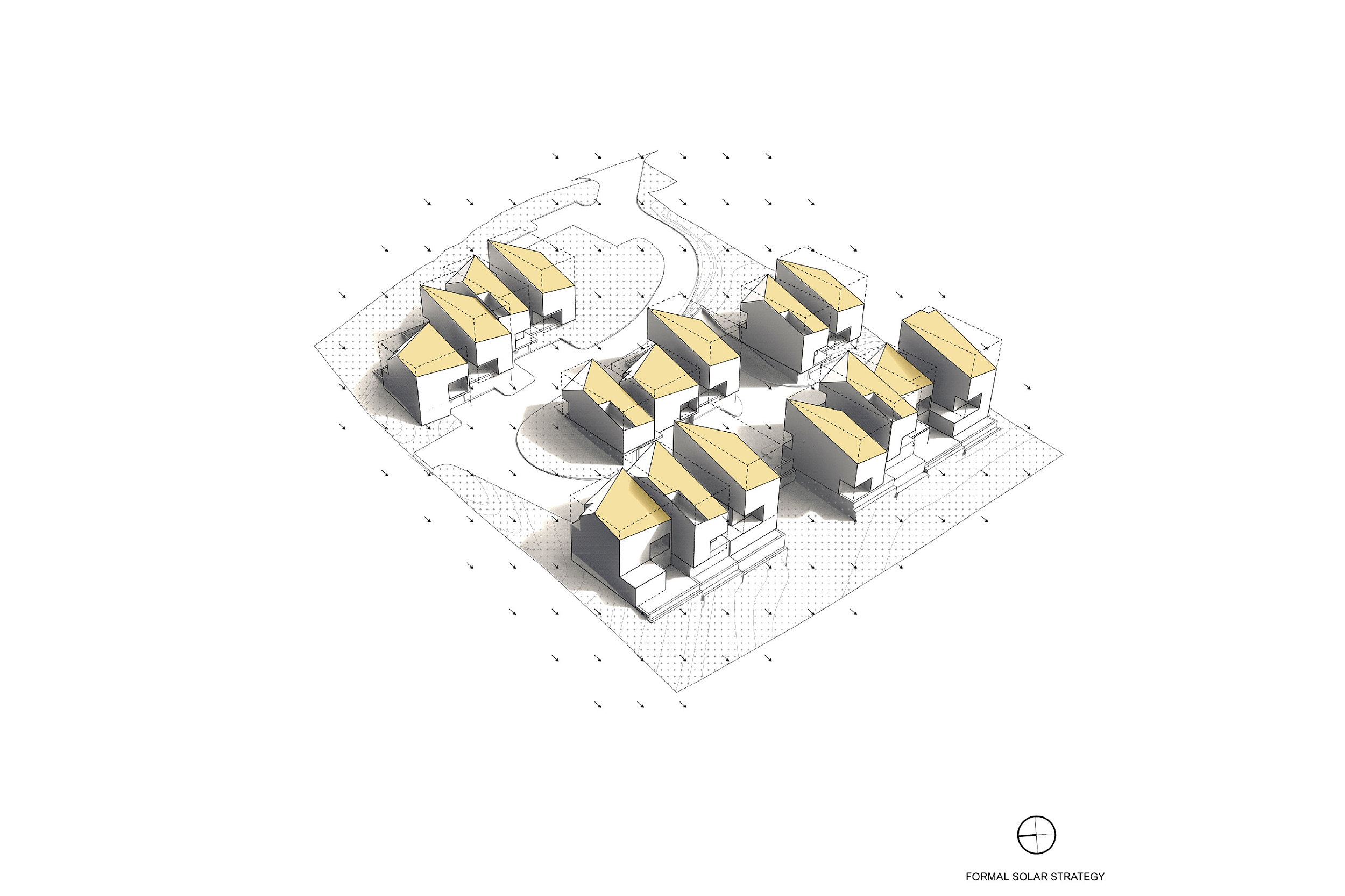 The new buildings are designed as a contemporary interpretation of the surrounding vernacular architecture strategically utilizing the gable roof and sloped profiles. All roof slopes facing due south will accommodate a solar photovoltaic panel array at each unit, while the additional varied roof angles will provide for more asymmetrical and organic roof lines and profiles for this steeply sloped wooded site.