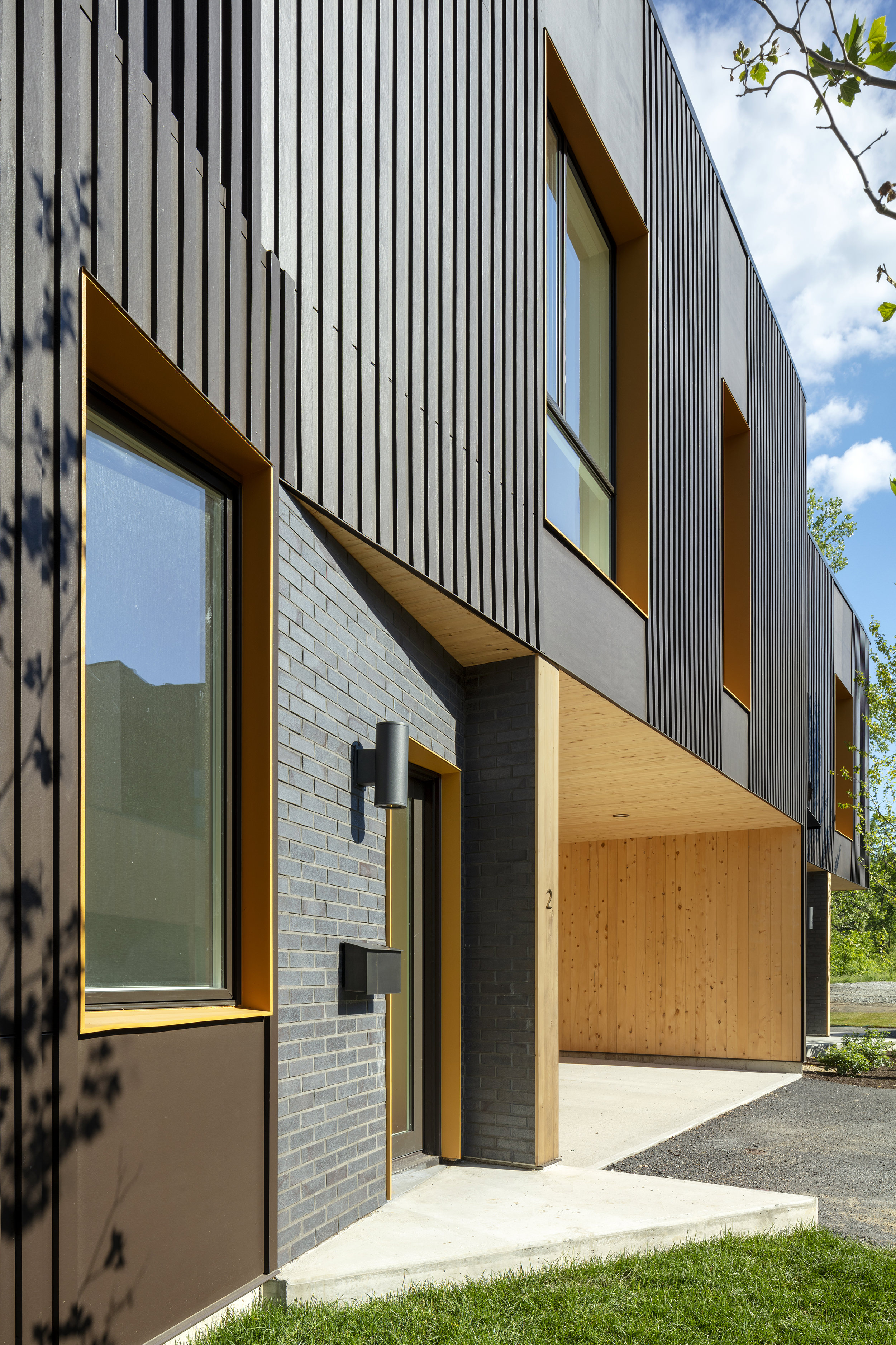 These voids register within an angled, overlapping, and alternating facade of cedar and fiber cement cladding to appear woven like the textiles once produced in the adjacent mills. Inexpensive charcoal gray Hardieboard panels are topped by slats of the same material in a riff on the board-and-batten siding that often clad the workers’ housing precedent. The dark Hardieboard and lighter cedar regions alternate on each of the seven duplexes to create a checkerboard-like rhythm as one walks the public pathway at the river’s edge.