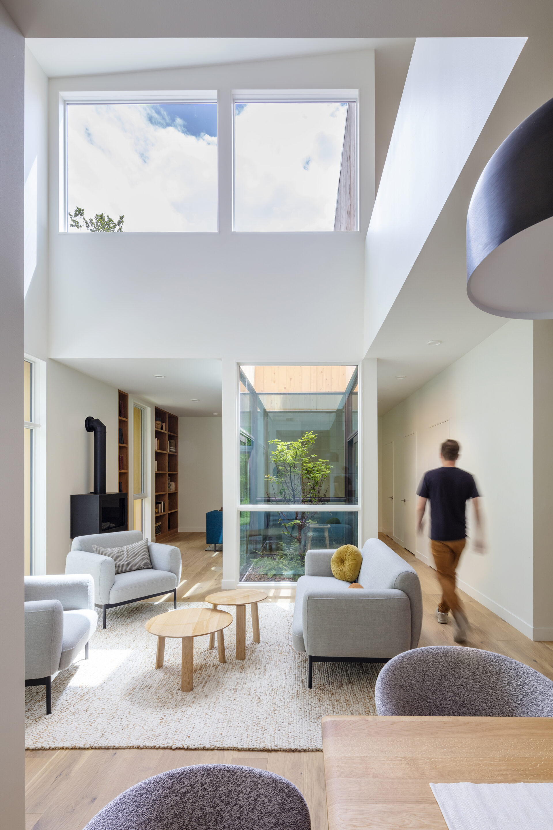 Removed some 150 years in time, the same diagram describes seven duplexes in this residential complex that also contains renovated mill buildings and the Modern Mill. The River Houses are boxy gabled forms that have been carved to create carports and patios. These subtractions produce a porous tableau that celebrates the residential scale and scenic setting. A second floor deck removes half of the gable and spills down to the first floor in the form of a small courtyard. In this way, the natural surrounds infiltrate the interior volume to the extent that they, themselves, are now surrounded: an unexpected container of vegetation, a source of light and ventilation through the unit.