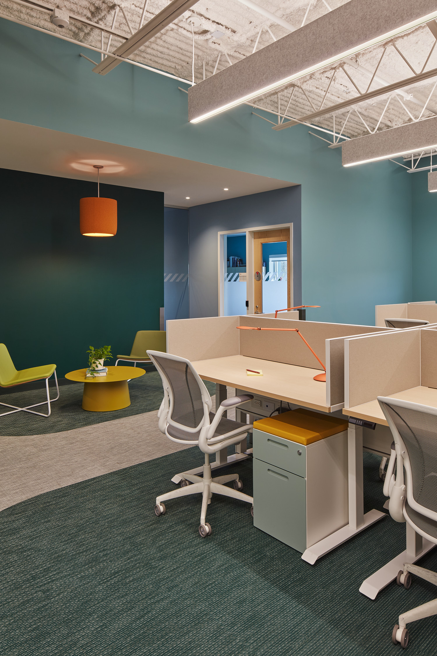 The site for the project was a 60’ deep by 300’ long warehouse owned by the City of Boston. This posed a planning challenge – the program area demanded a double-loaded corridor, but how to make 250 feet of circulation cut off from windows an attractive programmatic amenity? The design team sought to reimagine the double-loaded corridor as a luminous core, healthful, and bright. It is intended to serve as both circulation and a destination in itself. To achieve this a metal mesh ceiling partially conceals a luminous white plenum that diffuses natural sky light from solar tubes down to the floor. Light fixtures driven by photocells ramp up as daylight diminishes, maintaining the effect throughout the day. Translucent huddle rooms are tucked in under a soffit along one edge – the mechanical spine of the building – creating a sectionally active and layered space. Built-in benches and mobile seating in the huddles help further transform the corridor from a place of passage to a setting for informal meetings and impromptu teaching sessions.