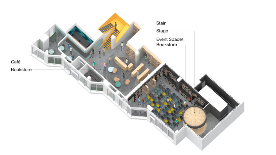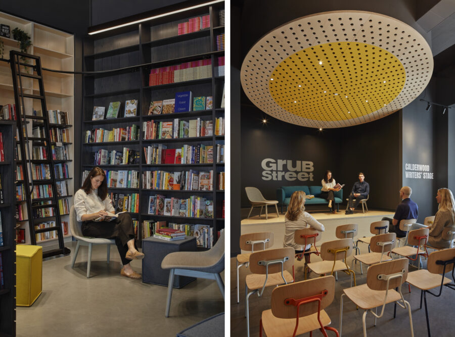 Ultimately, the architectural narrative gives way to the stories of aspiring authors, with the literary output of the second level spilling down the stair to reach a broader audience. A verse crafted in a classroom is shared on the stage. A novel drafted within a nook appears in the bookstore below. And a publication or podcast reaches ears beyond the building. Designed to enable and express GrubStreet’s mission, the space also empowers those within; a Center for Creative Writing that is also the center of “an expansive and equitable artistic ecosystem” that extends outwards from this origin on Boston Harbor.