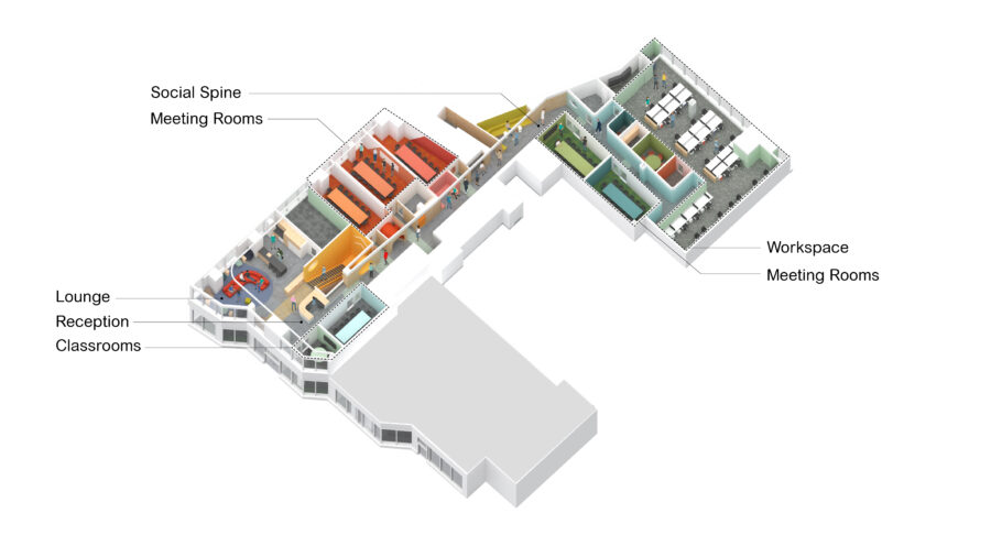 GrubStreet’s Center for Creative Writing is shaped to enable the nonprofit’s mission to “ensure writers of all backgrounds… share their stories” and act as a storytelling device itself, expressing the group’s creative, rigorous, and inclusive spirit. Occupying a designated nonprofit space in a luxury housing complex in Boston’s Seaport, GrubStreet’s aim of removing social, financial, and cultural barriers to self-expression is advanced by providing space for diverse authors in a waterfront neighborhood not designed with inclusivity in mind.
