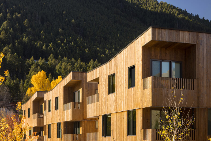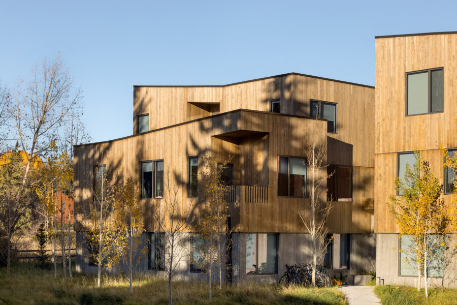 In order to address a need for workforce housing in the town of Jackson Wyoming, Merge navigated rigorous land development regulations to design this residential building at the base of Snow King Mountain. By pursuing a Planned Unit Development (PUD), the client was able to create 20-units of much needed housing where a traditional project would have only yielded eight. Working with a modest budget, Merge employed a series of strategies to design a building that is highly efficient, yet playful and refined.