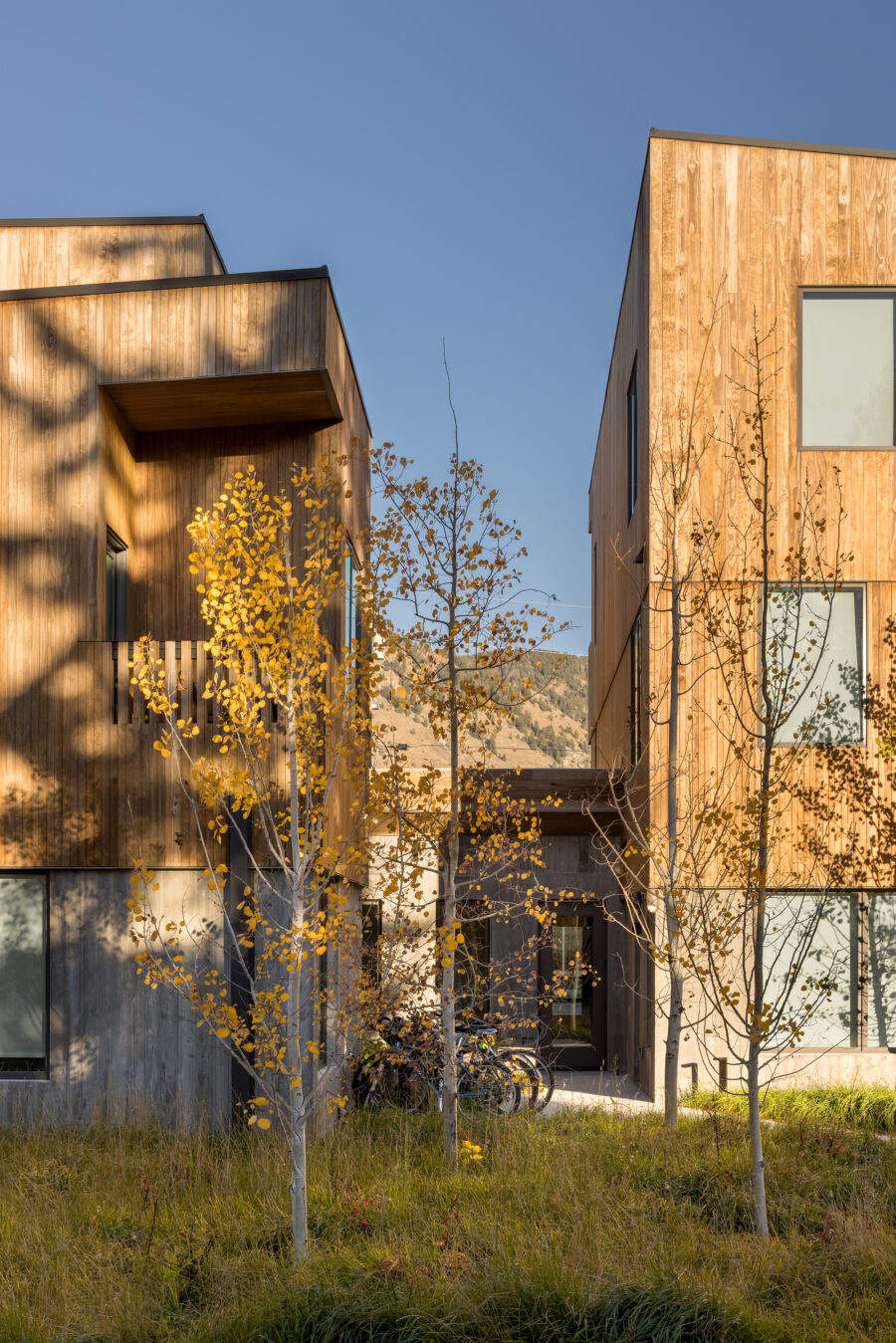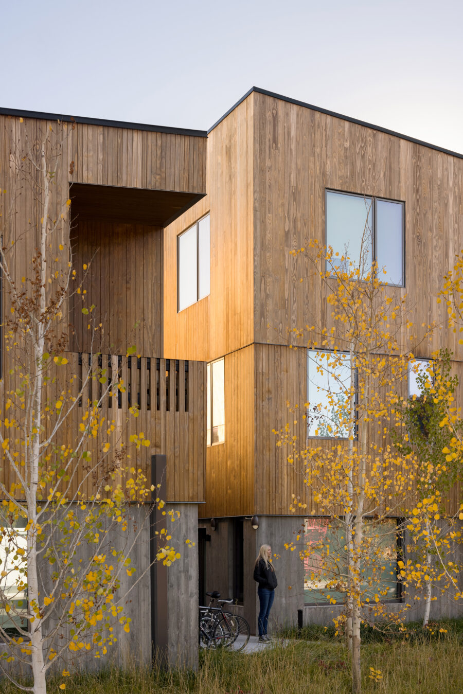 The building roofs utilize a combination of flat and sloped sections, composing a playful series of profiles that relate to the mountains beyond. Functionally, the configuration is carefully considered to provide ideal orientation on the sloped portions for rooftop solar arrays, while also concentrating snow onto the flat sections of roof to prevent it from sheeting off after heavy snowstorms.