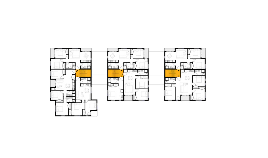 Connected by a ground floor plinth, the building is broken into three distinct volumes to help better mimic the scale of the neighborhood. By limiting each floor to 3 units, the distinct volumes can each be accessed by a single stair core, eliminating the need for any common corridor on the upper floors. This efficient circulation strategy maximizes light and air to the dwelling units while minimizing the need for common space.