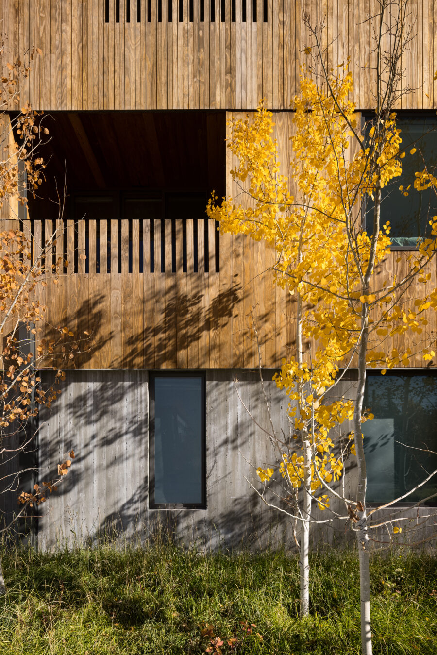 Composed primarily of vertical wood cladding, the exterior envelope explores a variety of ways to modulate this rhythm to accommodate shifts in scale, transparency, and resilience. Broken up into a series of horizontal bands, the cladding transitions subtly to vary texture without appearing patchy or disjointed. The two upper floors are differentiated by a material scale shift with wider boards on the second floor and narrower boards on the third. Rather than disrupt this material as it encounters one of several recessed balconies, the profile of the wood is carved away to create a seamless transition from cladding to guardrail, while providing transparency into the space beyond. At the ground floor, there has been careful consideration to the site and climate, as the building must accommodate the potential for 8 foot snow drifts. This is addressed by inverting the wood cladding and using it as form work for a poured concrete base, providing necessary durability while preserving the rhythm of the cladding above.