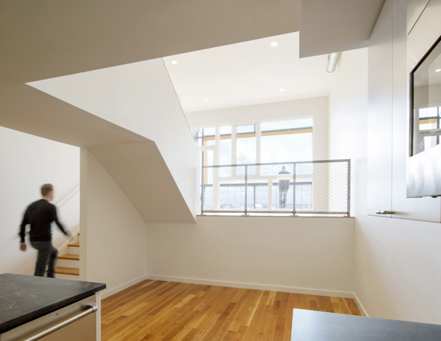 The last of these layers is a balcony clad in red cedar subtly reminiscent of the building’s clapboard-clad neighbors. Railings are created by a metal frame surrounded by angled regions of metal mesh. A nautical allusion to the adjacent active shipyard, this custom-crafted netting and frame detail combines factory fabrication and the handmade. Each panel was first assembled off site by the mesh manufacturer and then painstakingly woven into cables defining the edge of each facet on site.