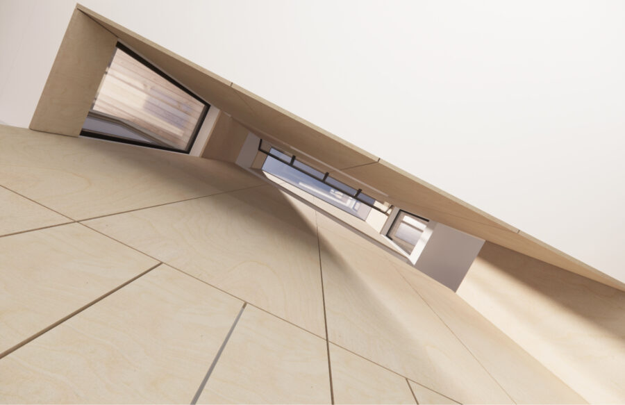 New insulation, windows, and all-electric heating and cooling systems address the energy performance of existing units. Their layout is unaltered aside from the removal of the rear stairwell and decks. In their place – and in the spirit of spatial efficiency – is constructed a scissor stair. This compact circulation core provides access to existing units and a new roof deck while interlocking with another stair inside the new rear unit. Like a townhouse, the unit contains living spaces on the ground and sleeping spaces above. Unlike a townhouse, however, these levels are united by a stack vent that pulls cool air through windows (salvaged from the removed rear) and exhausts out an operable skylight. As the scissor stair dances about this atrium, it suggests the shifting volumes of the exterior mass. Resultant voids become decks for the existing units, replacing those sacrificed in construction.
