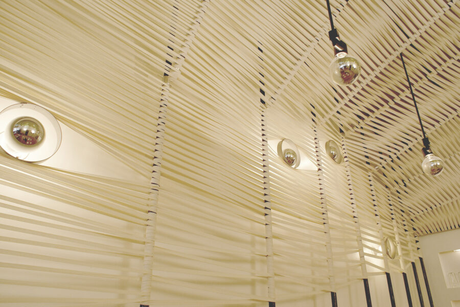The main dining room features a less overt, more hand-crafted interpretation of the mountains in materials and forms that blend allusions. Varying thicknesses of cotton straps – composed of the same cloth of a dinner napkin – weave across a framework of plumbing pipe to imply a jagged mountain backdrop of gradated density. Ths woven assembly is then broken strategically by nine lighting elements: silver-dipped light bulbs recalling the nine eyes of Buddha.