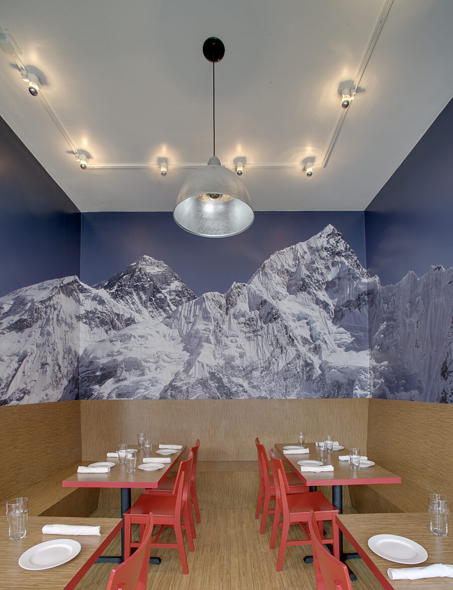 The two dining rooms interpret the high peaks at different resolutions. In the smaller of the two spaces, a ring of engineered wood booths gives way to a supergraphic photograph of Mount Everest. The panorama extends across all walls and up to the ceiling to create a totalizing environment.